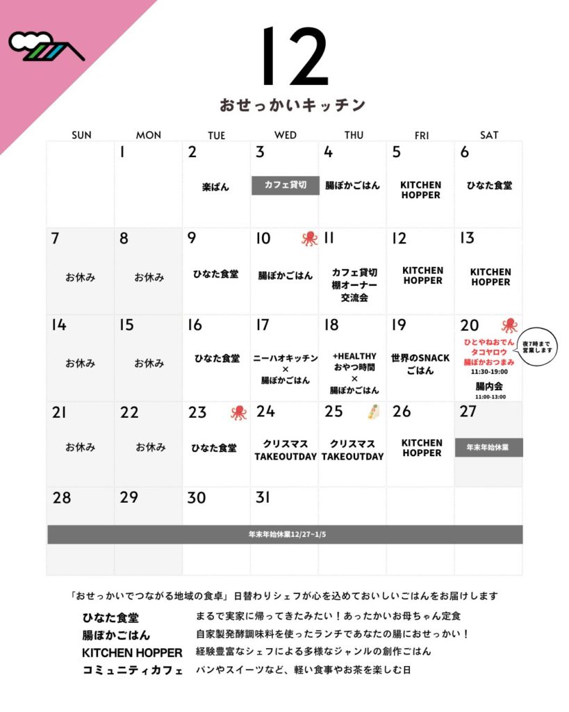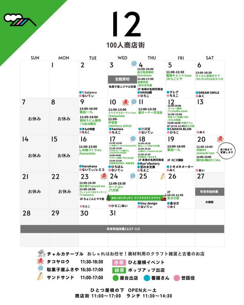 12月は、ひとやねのシェフたちが腕によりをかけた クリスマス料理テイクアウトDAYや、おでんの日、 プレゼントにぴったりの雑貨や本のワークショップや販売、 年末年始に向けてワクワクする出店企画が盛りだくさん!